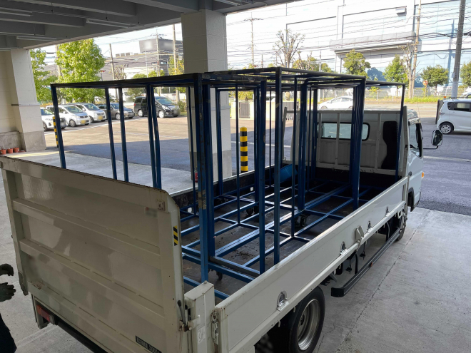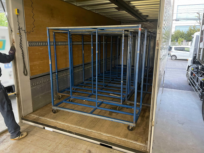 大量のラックを迅速かつ安全に運び出すため、大型平車を手配。